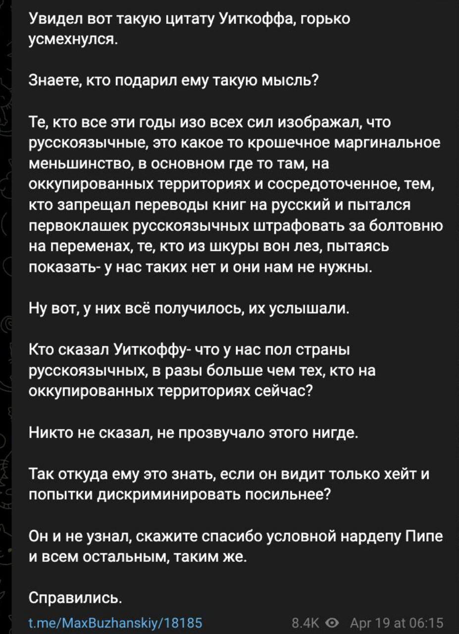 "Побачив ось таку цитату Уіткоффа, гірко посміхнувся. Знаєте, хто подарував йому таку думку? Ті, хто всі ці роки щосили зображував, що російськомовні, це якась крихітна маргінальна меншість, в основному десь там, на окупованих територіях і з окупованих територіях і з окупованих територіях і з намагався першокласників російськомовних штрафувати за балаканину на перервах, ті, хто зі шкіри геть ліз, намагаючись показати - у нас таких немає і вони нам не потрібні.