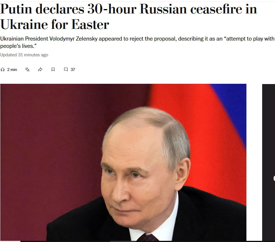 Видання The Washington Post повідомило, що Путін оголосив про 30-годинне перемир'я, але Зеленський, судячи з усього, відкинув його.
