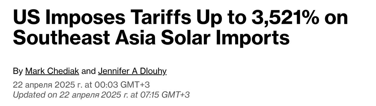Рішення американської влади запровадити астрономічні мита стало результатом розслідування, розпочатого ще за Джо Байдена. Воно встановило, що сонячні елементи, що імпортуються із зазначених країн, надходять на ринок США за демпінговими цінами, до того ж виробники сонячних панелей отримували державні субсидії від китайського уряду.