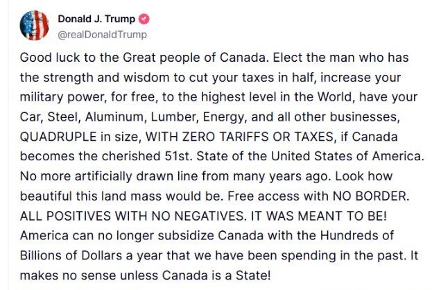 Трамп написав у своїй соцмережі Truth, що "кордон між країнами штучна". Він "побажав успіху" канадцям у виборі "особи, у якої буде сила і мудрість знизити податки вдвічі, безкоштовно збільшити військову міць до найвищого рівня у світі, в чотири рази збільшити компанії з нульовими тарифами або податками".