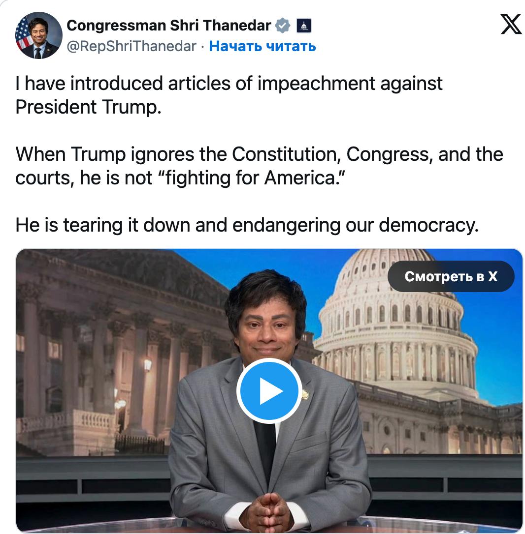 Конгресмен Демократичної партії США від штату Мічиган Шрі Танедар представив "сім статей про імпічмент" проти президента Дональда Трампа.