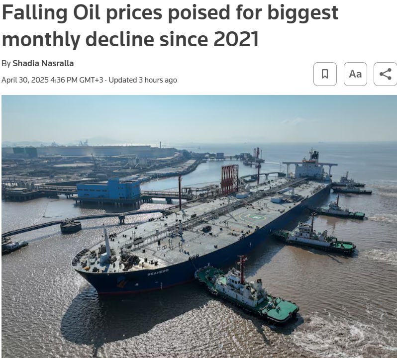 Ціна нафти Brent вдруге за квітень опустилася до позначки 60 доларів за барель. Падіння цін на нафту стане найбільшим місячним падінням за три роки.