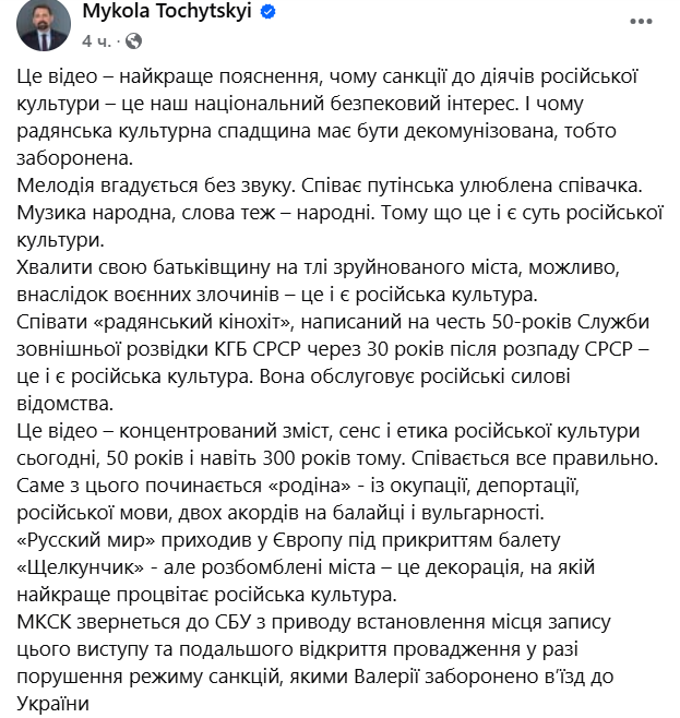 Міністр культури Микола Точицький сказав, що звернеться до СБУ для встановлення місця запису відео та подальшого відкриття виробництва у разі порушення російською співачкою українського кордону санкцій, які забороняють їй в'їжджати до України.