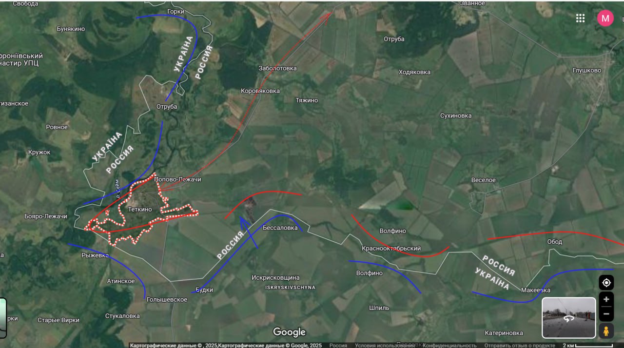 Біля кордону Сумської області, але вже на території Білгородської, росіяни відсунули фронт від села Демидівка, повідомляє військовий паблік Deep State. При цьому минулого тижня російські паблики повідомляли, що Демидівка та Поповка вже повернуто під контроль РФ.