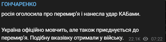 "Україна офіційно мовчить, але також приєднується до перемир'я. Подібну вказівку отримали в армії", - написав Гончаренко.