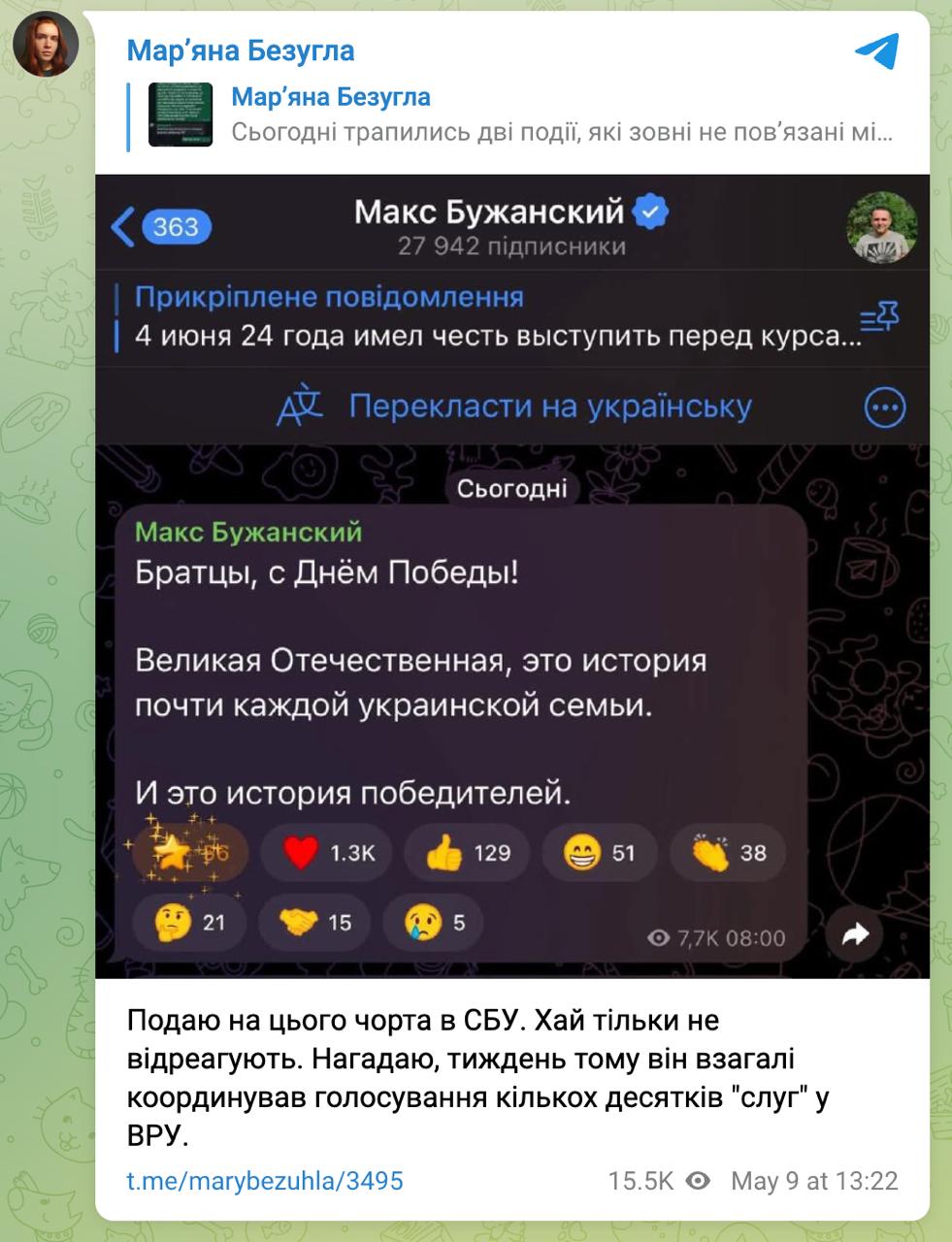 Народний депутат Мар'яна Безугла написала заяву до Служби безпеки України на колегу-парламентарію з партії "Слуга народу" Максима Бужанського через його вітання з 9 Травня, в якому він використав поняття Велика Вітчизняна війна.