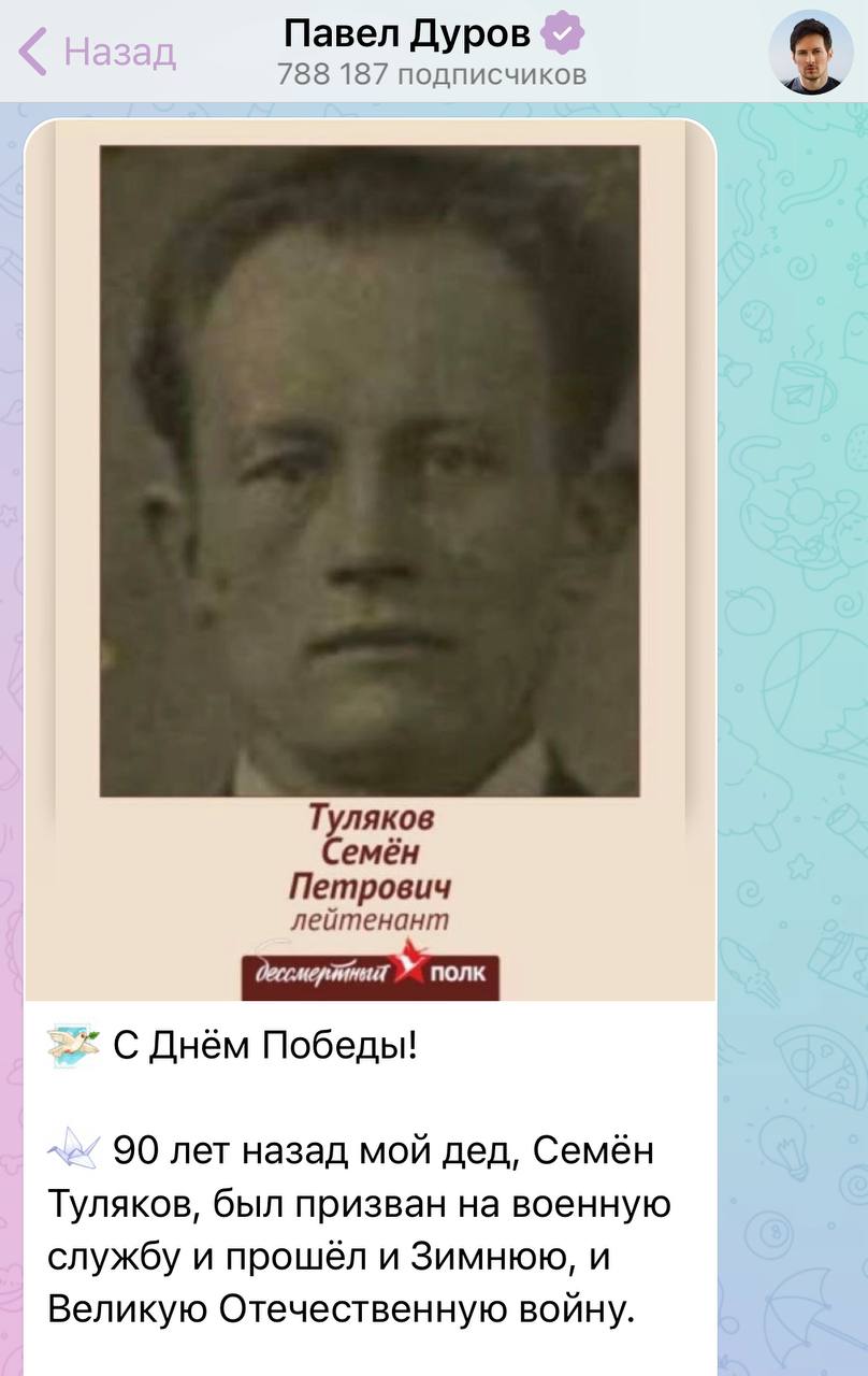 "З Днем Перемоги! 90 років тому мій дід, Семен Туляков, був покликаний на військову службу і пройшов і Зимову, і Велику Вітчизняну війну. Він був командиром взводу і лейтенантом. За іронією долі, ті ж звання я отримав 20 років тому на військовій кафедрі СПбГУ. медалями "За оборону Ленінграда", "За перемогу над Німеччиною", а також орденами Вітчизняної війни І та ІІ ступеня та орденом "Червона Зірка»", - написав Дуров у Телеграмі.