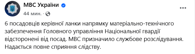 "Шість посадовців керівної ланки напряму матеріально-технічного забезпечення Головного управління Національної гвардії відсторонені від посад. МВС призначило службове розслідування. Надається повне сприяння слідству", - йдеться у повідомленні.