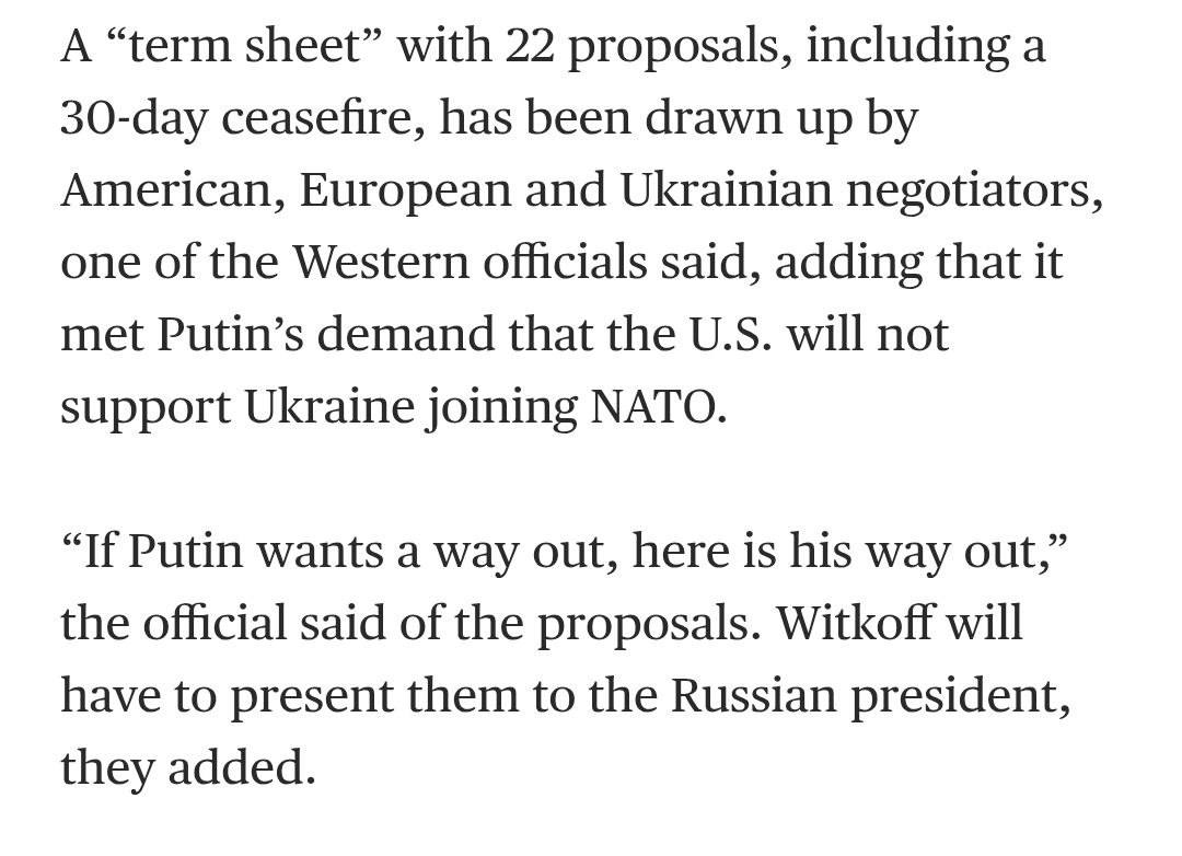 У матеріалі не вказуються інші пункти цього плану, зокрема, чи невідомо чи є серед них визнання Криму російським та зняття американських санкцій з РФ, що містилося у раніше оприлюдненому ЗМІ "плані Трампа".