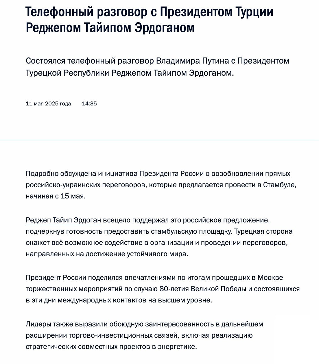 У ньому йдеться, що президент РФ пропонує Україні розпочати прямі переговори з 15 травня. Тобто, найближчого четверга.