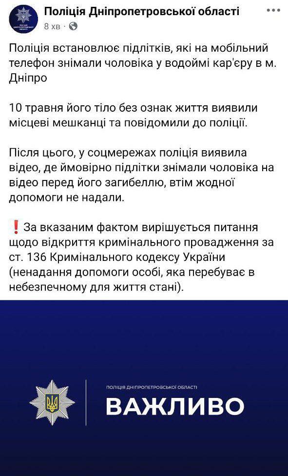 У Дніпрі поліція встановлює підлітків, які на мобільний телефон знімали чоловіка, який тонув, проте не допомогли йому. В результаті він загинув.