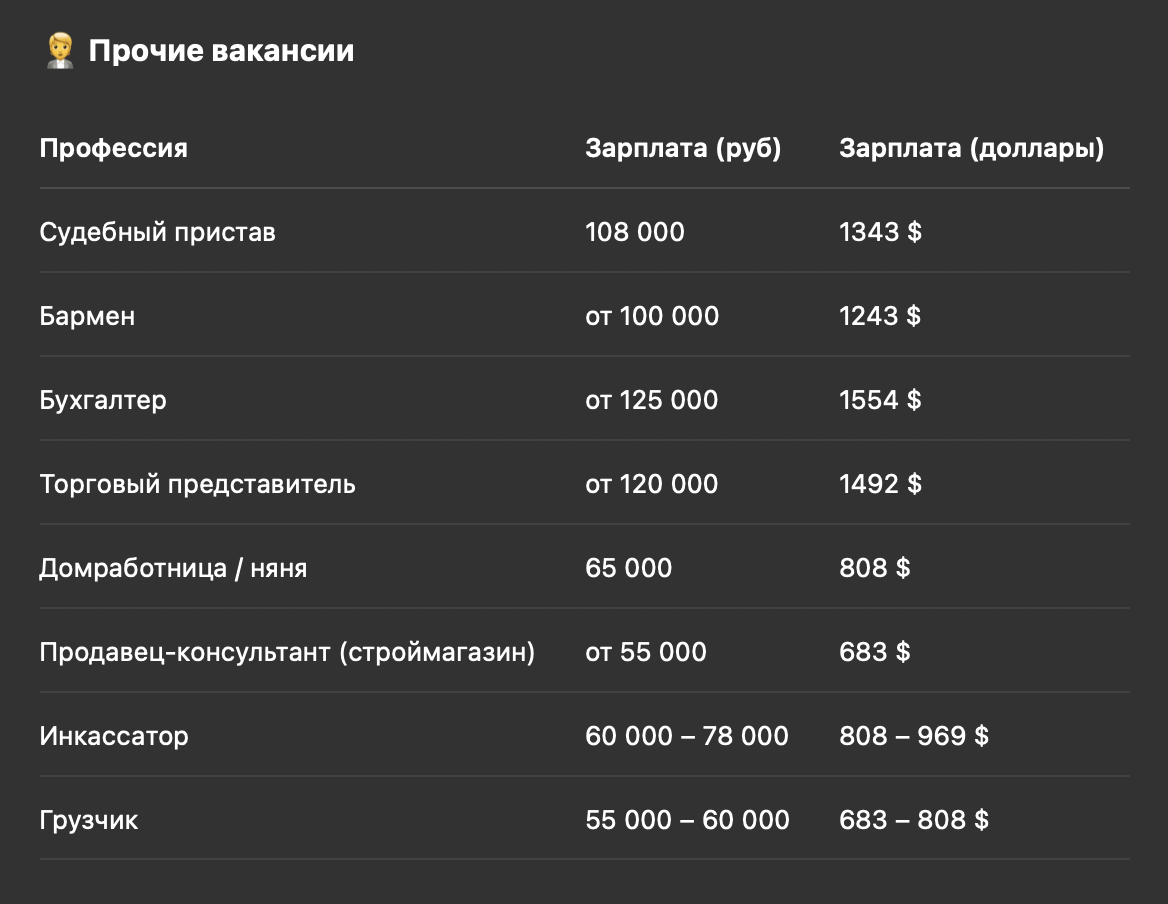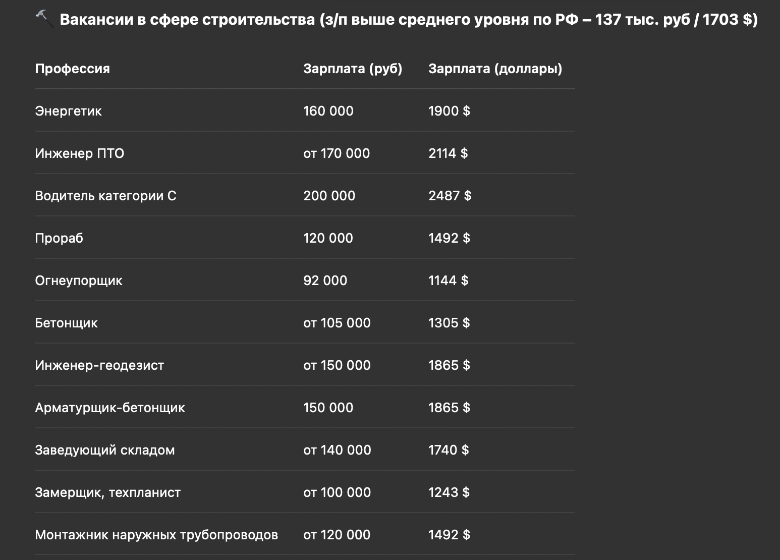 Тут кандидатам пропонуються вакансії, які оплачуються найчастіше вище за середньоросійський рівень (середня зарплата в будівництві РФ становить 137 тисяч рублів або 1703 долари).