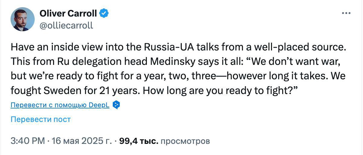 16:54 Журналіст The Economist Олівер Керрол повідомляє, що Мединський поставив таке питання на переговорах з Україною: "Ми не хочемо війни, але готові воювати ще рік, два, три - стільки, скільки буде потрібно. Ми воювали зі Швецією 21 рік. А ви скільки готові воювати?"