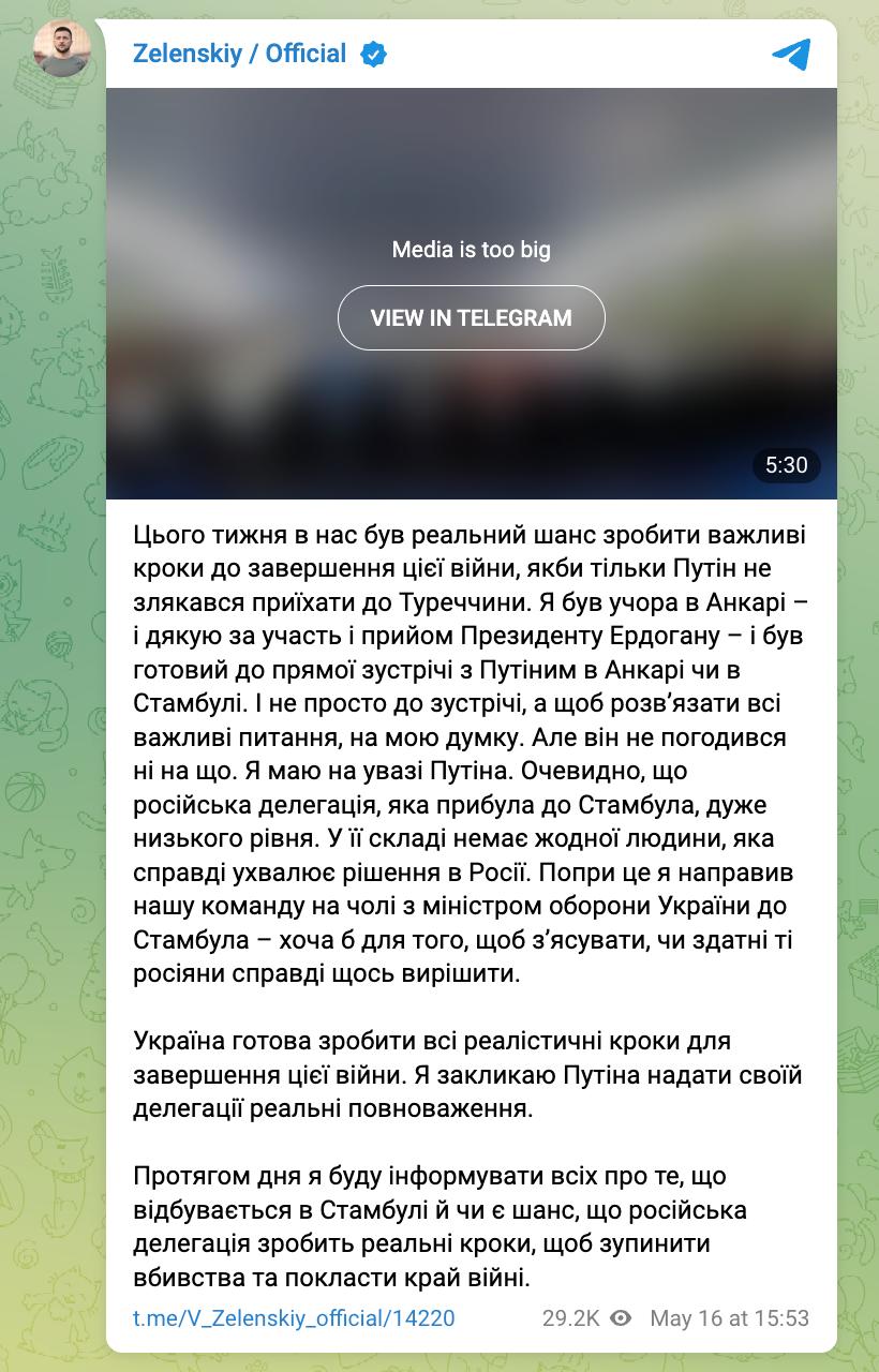 08:08 Україна та Росія "мають шанси" виробити документ щодо завершення війни на переговорах у Стамбулі.
