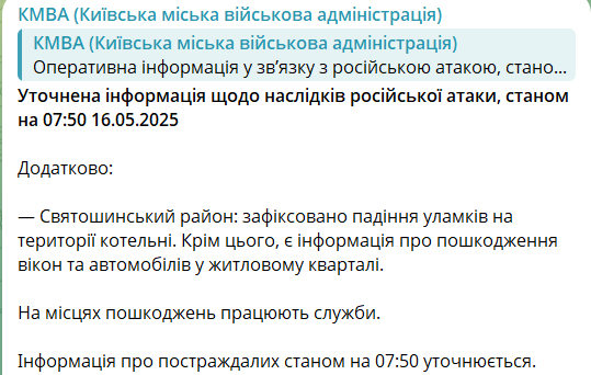 08:16 Київ зранку атакували дрони. У КГВА повідомляють, що зафіксовано падіння уламків на території котельні у Святошинському районі. Крім того, є інформація про пошкодження вікон та автомобілів у житловому кварталі.