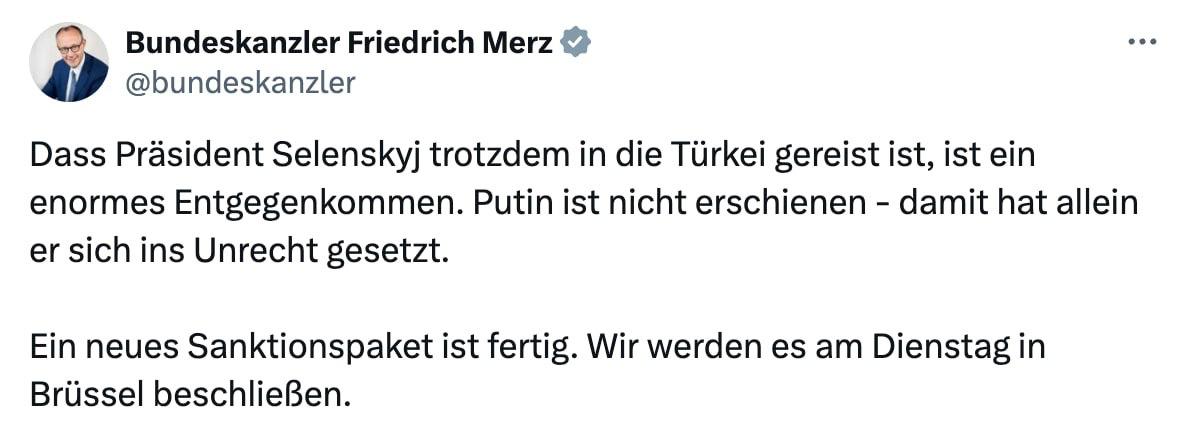 Канцлер Німеччини Мерц також звинуватив Москву у зриві переговорів, але наголосив, що на переговорах стався "дуже маленький, але перший позитивний сигнал".