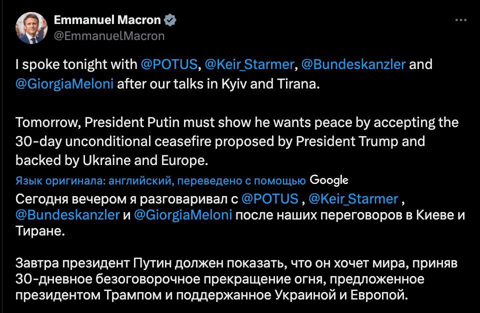 "Завтра президент Путін має показати, що він хоче миру, прийнявши 30-денне беззастережне припинення вогню, запропоноване президентом Трампом і підтримане Україною та Європою", - написав французький президент за підсумками розмови.