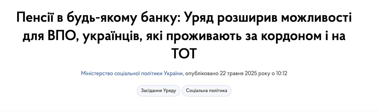 Українські переселенці, які мешкають на тимчасово окупованих територіях і виїхали звідти за кордон, тепер зможуть отримувати пенсію не лише в Ощадбанку, а й в інших уповноважених банках або через Укрпошту.
