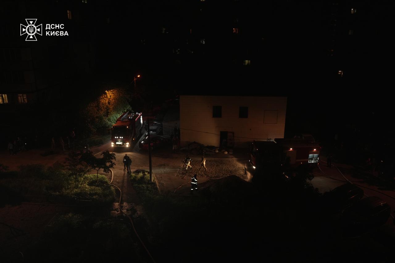 В Оболонському районі у дев'ятиповерховому будинку зайнялися балкони на чотирьох поверхах. Приліт уламків був по торговому центру.