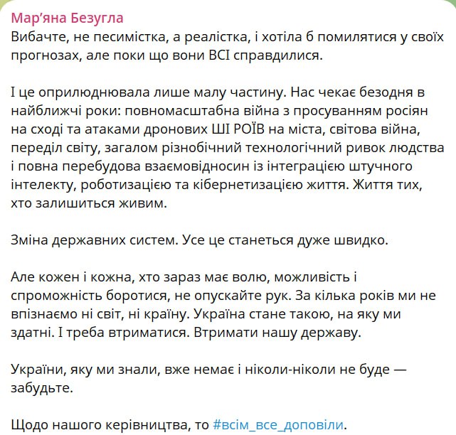 "Нас чекає безодня найближчими роками: повномасштабна війна з просуванням росіян на сході та атаками дронових ІІ-роїв на міста... України, яку ми знали, вже немає і ніколи не буде - забудьте", - написала нардеп.