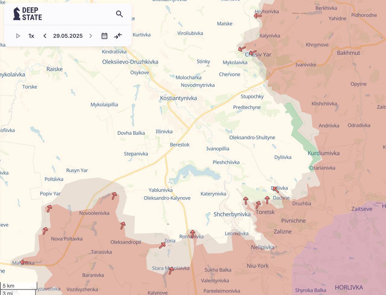 Тому якщо подібна ситуація складеться і на інших ділянках фронту, то й там можливе повторення прориву. Схожа на "курську" конфігурація фронту, до речі, зараз складається на південний схід від Костянтинівки після просування росіян між Покровськом та Торецьком. Там українські війська опинилися у виступі, що прострілюється з усіх боків російськими дронами.