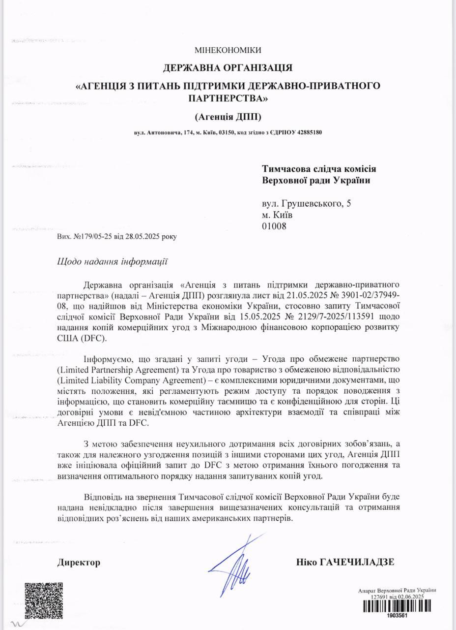 "Інформуємо, що згадані в запиті угоди – Угода про обмежене партнерство (Limited Partnership Agreement) та Угода про товариство з обмеженою відповідальністю (Limited Liability Company Agreement) – є комплексними юридичними документами, що містять положення, які регламентують режим доступу та порядок поводження з інформацією, що становить комерційну таємницю та є конфіденційною для сторін", - йдеться у відповіді.