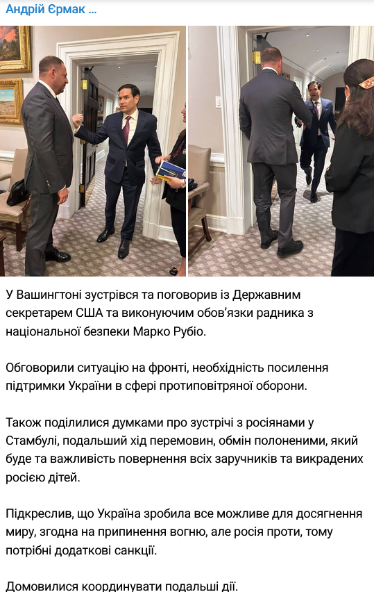 Єрмак у США зустрівся з Рубіо та зажадав додаткових санкцій проти Росії. Фото