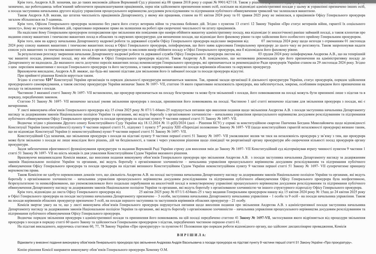 Тому скоротити його посаду ніяк не можна і він розраховує, що керівництво запропонує йому посаду, сумісну з його знаннями та досвідом. І комісія прокурорів із такими доводами погодилася всупереч поданням в.о. генпрокурора.