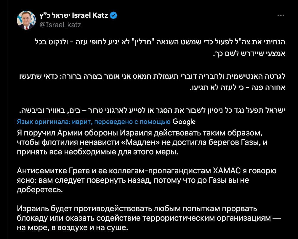 "Я доручив Армії оборони Ізраїлю діяти таким чином, щоб човен ненависті "Мадлен" не досяг берегів Гази, і вжити всіх необхідних для цього заходів. Антисемітці Греті та її колегам-пропагандистам ХАМАС я говорю ясно: вам слід повернути назад, бо до Гази ви не дістанетеся. Ізраїль протидіятиме будь-яким спробам прорвати блокаду", - написав Кац.