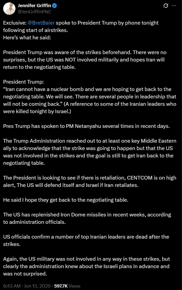 "Іран не може мати ядерну бомбу, і ми сподіваємося повернутися за стіл переговорів. Подивимося. Кілька людей із керівництва не повернуться", - заявив Трамп, маючи на увазі деяких іранських лідерів, убитих сьогодні вночі Ізраїлем.