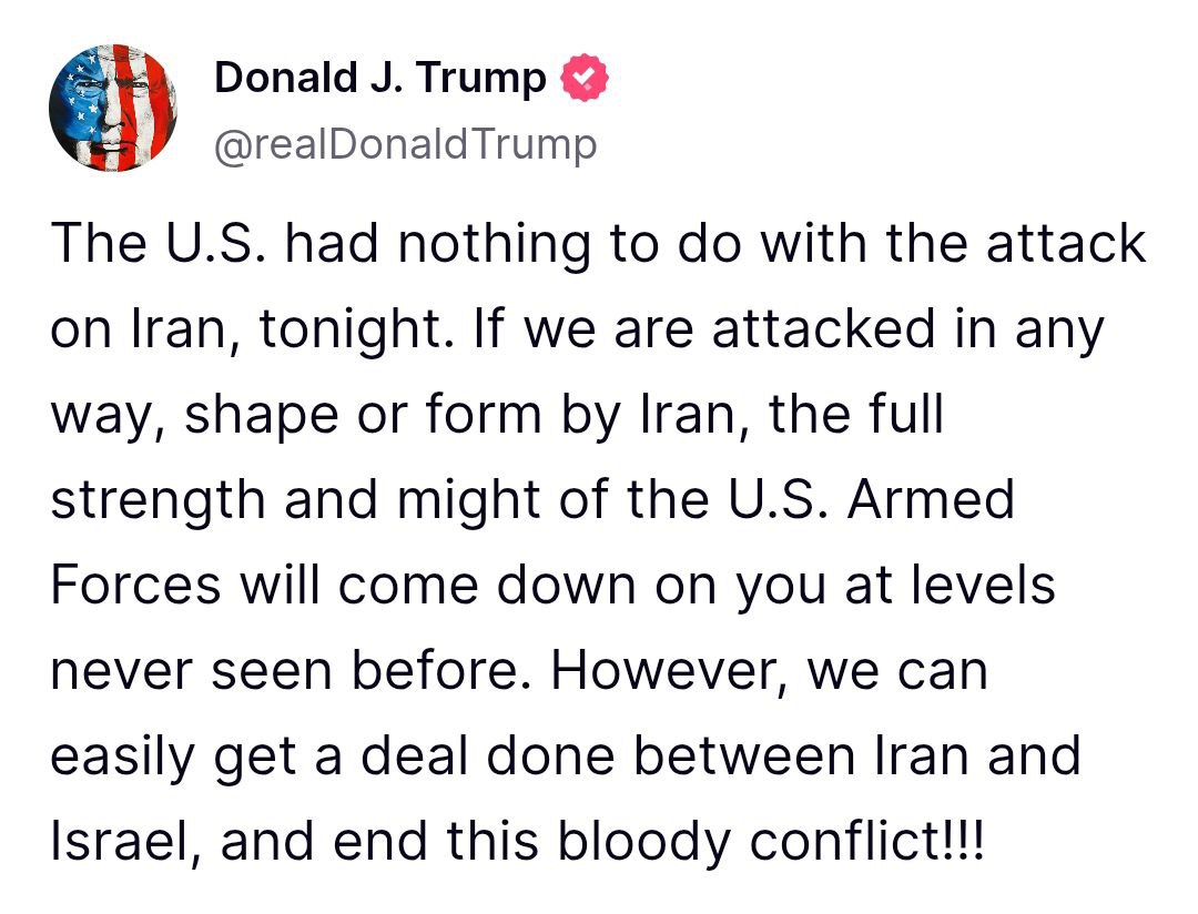 "США не мали жодного відношення до сьогоднішнього нападу на Іран. Якщо Іран якимось чином або в будь-якій формі нападе на нас, вся сила і міць збройних сил США впаде на вас на рівнях, яких ніколи не було. Однак ми можемо легко укласти угоду між Іраном та Ізраїлем і покласти кінець цьому соціальному конфлікту", - написав президент США.