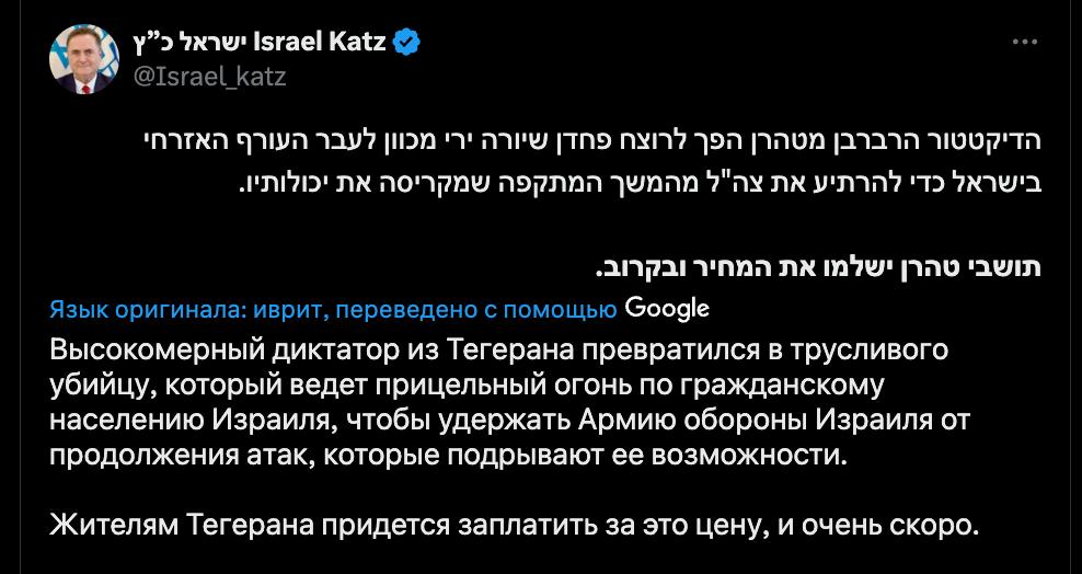 "Жителям Тегерана доведеться заплатити за це ціну і дуже скоро", - заявив Ісраель Кац.