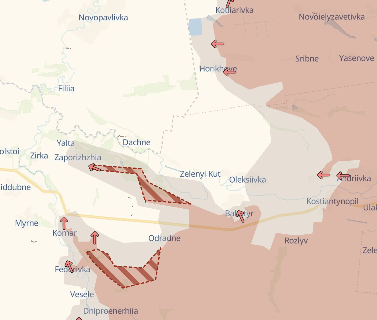 На південь від РФ просування в районі Комара і Відрадного, що утворює "мішок" вздовж траси на Запорізьку область.