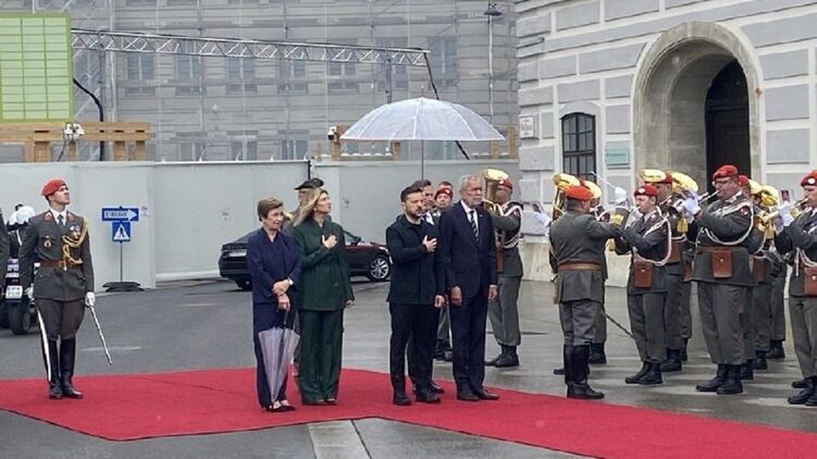 Також місцеві видання пишуть, що Зеленський залишив свою дружину під дощем у Відні. Так, бульварна газета Heute описала відео зустрічі президента України з Ван дер Белленом. Автори матеріалу вважають, що Зеленський припустився помилки.