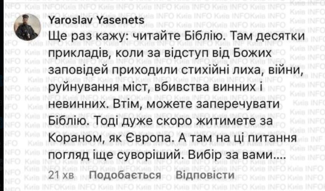 У коментарях Ясенець підтвердив свою позицію, пославшись на християнське вчення: "Читайте Біблію. Там десятки прикладів, коли за відступ від Божих заповідей приходили стихійні лиха, війни, руйнування міст, вбивства винних та невинних".
