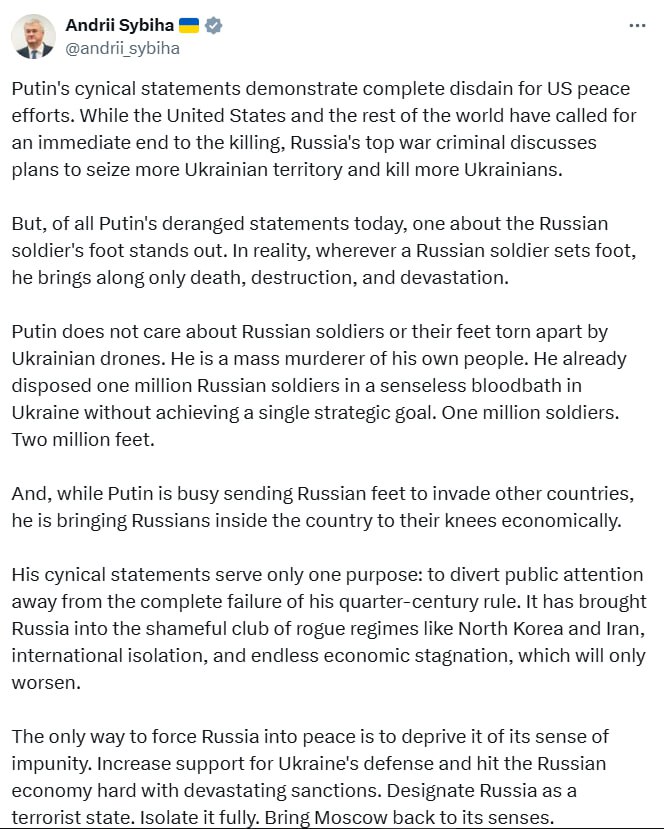 "Цинічні заяви Путіна демонструють повну зневагу до мирних зусиль США. У той час як США та решта світу закликають до негайного припинення вбивств, головний військовий злочинець Росії обговорює плани щодо захоплення більшої частини української території та вбивства більшої кількості українців", – написав Сібіга в Х.