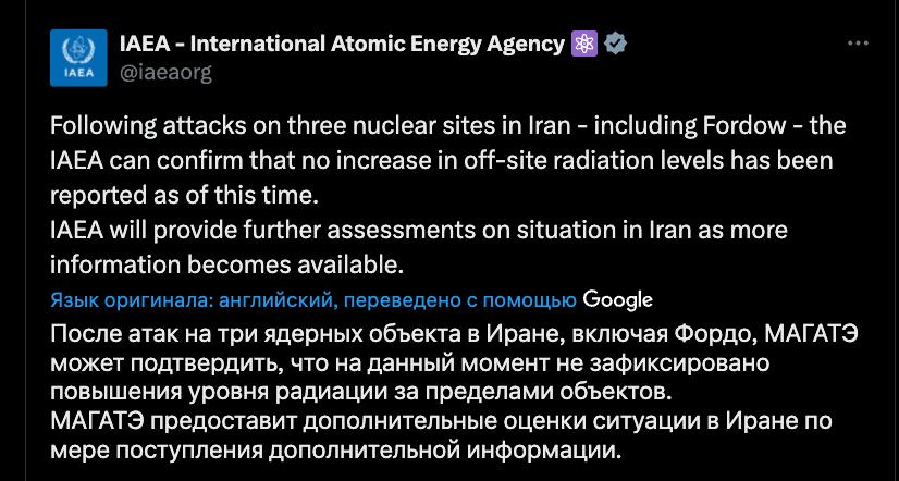"Після атак на три ядерні об'єкти в Ірані, включаючи Фордо, МАГАТЕ може підтвердити, що зараз не зафіксовано підвищення рівня радіації за межами об'єктів", - повідомило агентство.