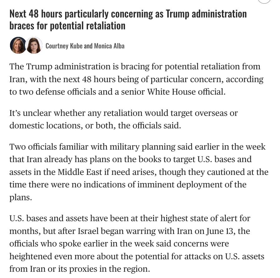 Адміністрація президента США Дональда Трампа готується до потенційної відплати з боку Ірану у відповідь на удари США, "і наступні 48 годин викликають особливе занепокоєння".