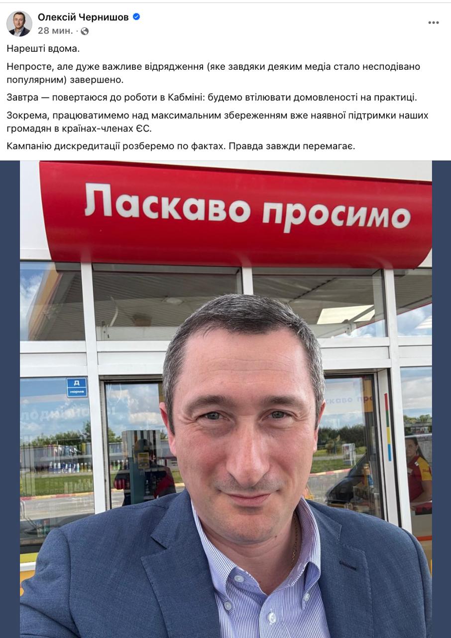 Пізніше і сам Чернишов на своїй сторінці у Фейсбуці також виклав посаду про своє повернення до України. Він пообіцяв прокоментувати "кампанію з дискредитації".