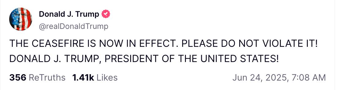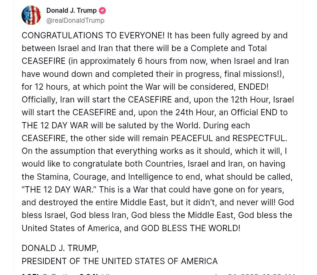 "ВІТАННЯ ВСІМ! Було повністю узгоджено між Ізраїлем та Іраном: буде оголошено ПОВНЕ І ТОТАЛЬНЕ ПРИПИНЕННЯ ВОГНЮ (приблизно через 6 годин, коли Ізраїль та Іран завершать свої поточні фінальні місії!), терміном на 12 годин, ВІЙНА БУДЕ ЗАВЕРШЕНОЮ! Офіційно, припинення вогню почне Іран, і після 12-ї години - Ізраїль, а після закінчення 24 годин усьому світу буде урочисто оголошено про ОФІЦІЙНЕ ЗАВЕРШЕННЯ 12-ДЕННОЇ ВІЙНИ. МИР І ПОВАГА. За умови, що все піде, як повинно (а, так і буде), я хочу привітати обидві країни - Ізраїль та Іран - з витримкою, мужністю і розумом, що дозволили покласти край тому, що можна назвати "12-ДЕННА ВІЙНА". Це була війна, яка могла продовжуватись роками і зруйнувати весь Близький Схід - але цього не сталося і не станеться! Нехай благословить Бог Ізраїль, нехай благословить Бог Іран, нехай благословить Бог Близький Схід, нехай благословить Бог Сполучені Штати Америки, і ТАК БЛАГОСЛОВИТЬ БОГ ВЕСЬ СВІТ!", - написав він.