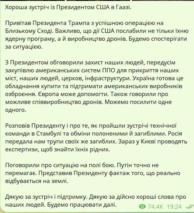 "Україна готова це обладнання купити та підтримати американських озброєних виробників. Європа може допомогти. Також говорили про можливе виробництво дронів. Можемо посилити один одного", – повідомив Зеленський.