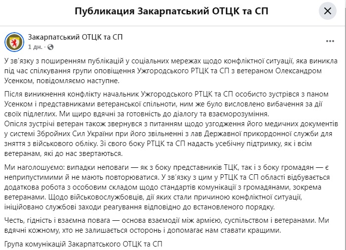 Після резонансу в соцмережах Закарпатський ОТЦК у тому ж Фейсбуці повідомив, що начальник Ужгородського РТЦК та СП зустрівся з Усенком та представниками ветеранського співтовариства та вибачився за дії своїх підлеглих.