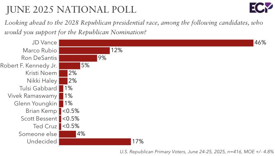 Більшість опитаних республіканців (46%) вважають віце-президента Джей Ді Венса найкращим кандидатом на наступних президентських виборах, які відбудуться у 2028 році.
