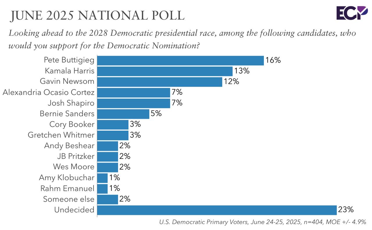 Демократи явного лідера не мають. На першому місці розташувався колишній міністр транспорту Піт Буттіджич з 16%, а Камала Харріс, яка програла Дональду Трампу, опинилася на другому місці з 13%. За ними слідують губернатор Каліфорнії Гевін Ньюсом (з 12%), губернатор Пенсільванії Джош Шапіро та член палати представників Олександрія Окасіо-Кортес (у них по 7%). Сенатор від штату Вермонт лівого штибу Берні Сандерс набрав 5%.
