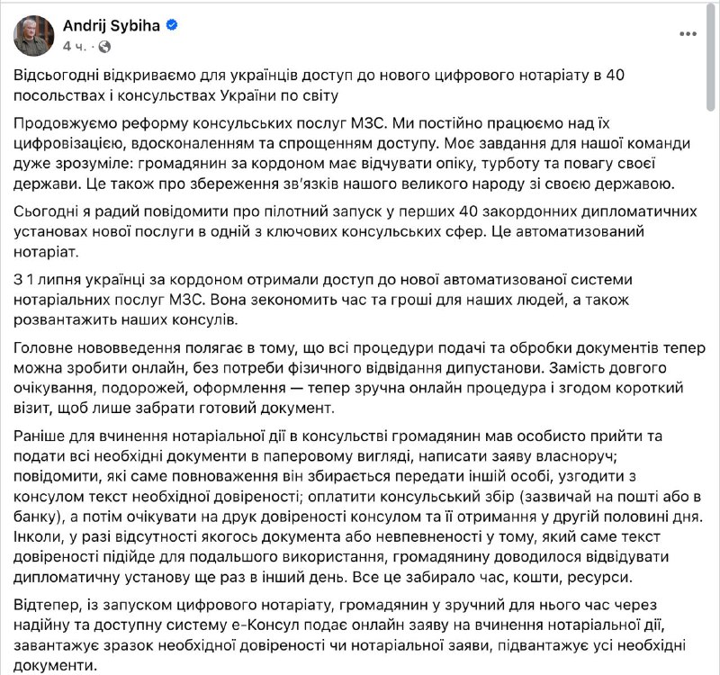 "Усі процедури подання та обробки документів тепер можна зробити онлайн, без необхідності фізичного відвідування дипломатичного представництва. Замість довгого очікування, поїздок, оформлення тепер зручна онлайн-процедура та згодом короткий візит, щоб лише забрати готовий документ", - написав Сібіга.