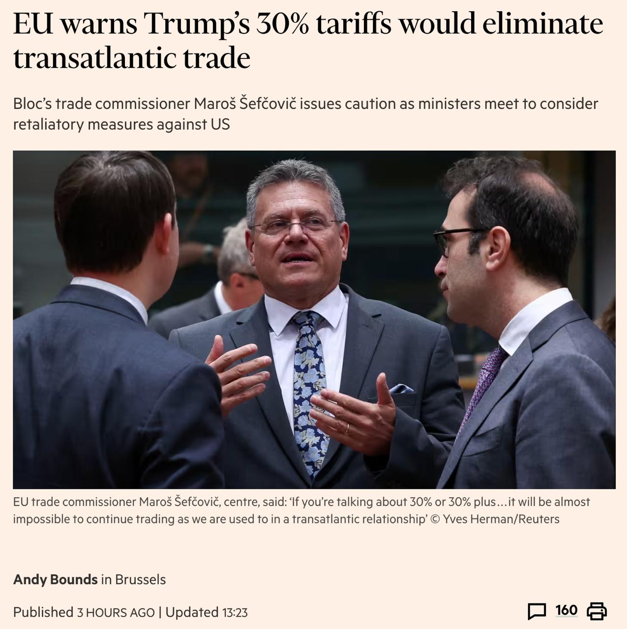 Торгівля між Євросоюзом та США стане "практично неможливою", якщо американський президент Дональд Трамп запровадить 30-відсоткові мита, як загрожує зробити з 1 серпня.
