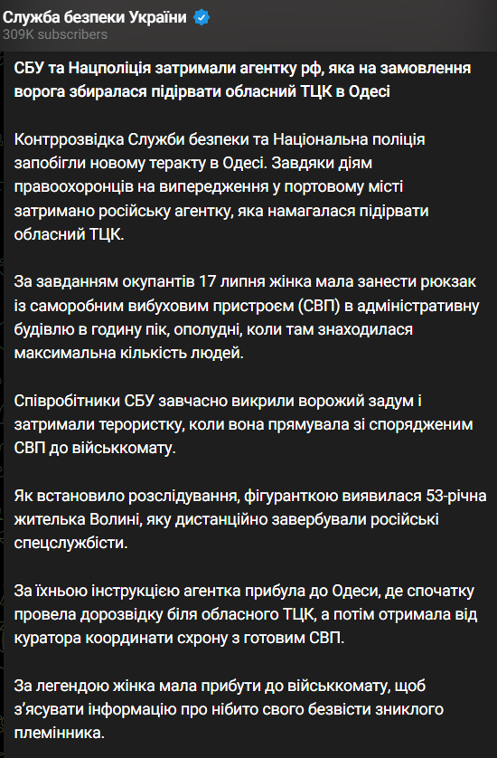 Служба безпеки повідомляє про затримання в Одесі жінки з вибухівкою, яка готувалася до теракту в ТЦК.