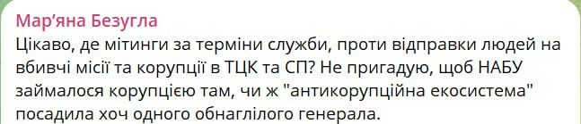 "Цікаво, де мітинги за терміни служби проти відправки людей на вбивчі місії та корупції до ТЦК та СП? Не пам'ятаю, щоб НАБУ займалося корупцією там чи "антикорупційна екосистема" посадила бодай одного генерала, що нахабився", - написала вона.