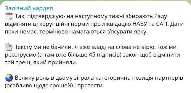 Його інформацію підтвердив нардеп із "Голосу" Ярослав Железняк, який стверджує, що наступного тижня Раду зберуть, щоб скасувати прийняті вчора норми, що обмежують повноваження НАБУ та САП.