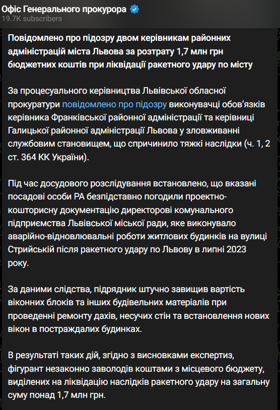 Офіс генпрокурора повідомив про підозру двом керівникам районних адміністрацій Львова за розтрату 1,7 млн. грн. бюджетних коштів при ліквідації ракетного удару по місту.
